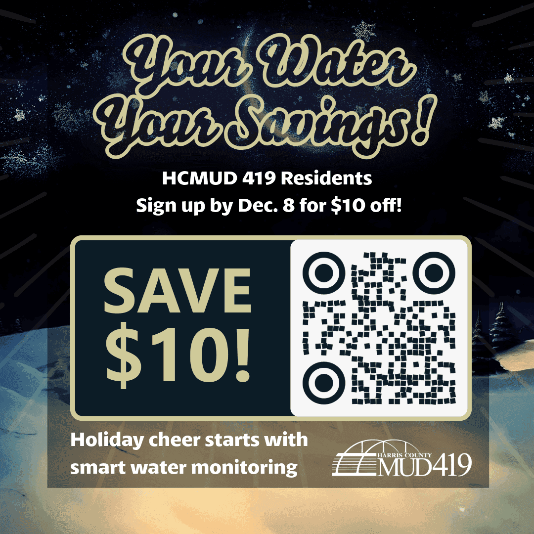HCMUD 419 is bringing holiday magic to your water bill! Residents who sign up for EyeOnWater by December 8, 2025, will receive a $10 credit—your very own “golden ticket” to savings.